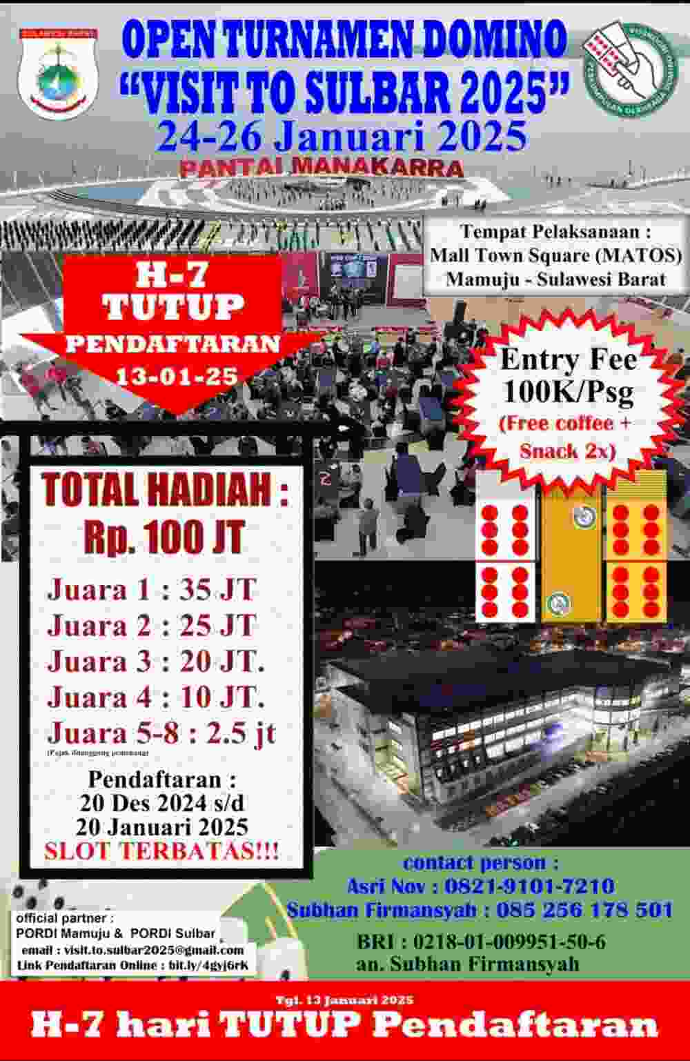 Event berskala nasional pekan depan rencananya kembali di helat di Kota Mamuju, setelah tahun 2024 lalu sukses menggelar ‘Open Tournament Celebes-Borneo’, kini di awal tahun 2025, pemprov Sulbar bersama dengan Perkumpulan Olahraga Domino Indonesia (Pordi) Sulbar dan Pordi Mamuju rencananya akan kembali menggelar event yang berskala nasional yakni. Open Tournament ‘Visit to Sulbar 2025’ yang akan digelar di Mall Maleo Town Square (Mall Matos), Mamuju pada tanggal 24 sampai 26 Januari 2025 mendatang