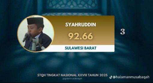 Berdasarkan data resmi LPTQ Nasional yang dapat diakses melalui laman lptqnasional.org, dari total 20 peserta perwakilan provinsi yang sudah tampil, Syahruddin berhasil mengantongi nilai 92,6 poin, menempatkannya pada posisi tiga besar sementara di tingkat nasional.