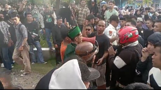 Namun saat ban di bakar terjadi provokasi dan aksi saling ejek. Hingga ada demonstran berbaju coklat yang membawa bendera HMI mengarahkan ke area kepala dan wajah kerumunan mahasiswi sambil digoyang goyangkan.