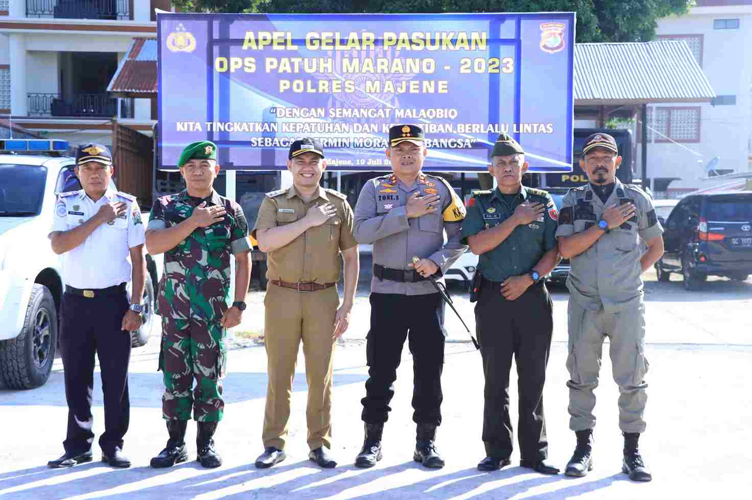 Bertindak sebagai inspektur apel, Kapolres Majene AKBP Toni Sugadri yang dihadiri oleh Wakil Bupati Majene Arismunandar Kalma, mewakili Dandim 1401 Majene Lettu Inf. Rusli, Danki Senapan A Yonif 721 Makkasau Lettu Inf. Ramli, Wakapolres Majene, mewakili Kadis Perhubungan Majene, mewakili Kadis Pol PP Majene, para pejabat utama Polres Majene serta para tamu undangan.