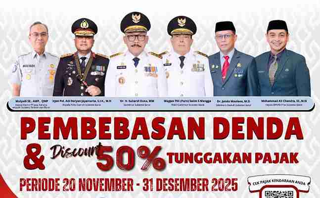 Program ini berlangsung mulai 20 November hingga 31 Desember 2025, memberikan kesempatan luas bagi wajib pajak di seluruh kabupaten se-Sulbar untuk memperoleh keringanan besar-besaran.
