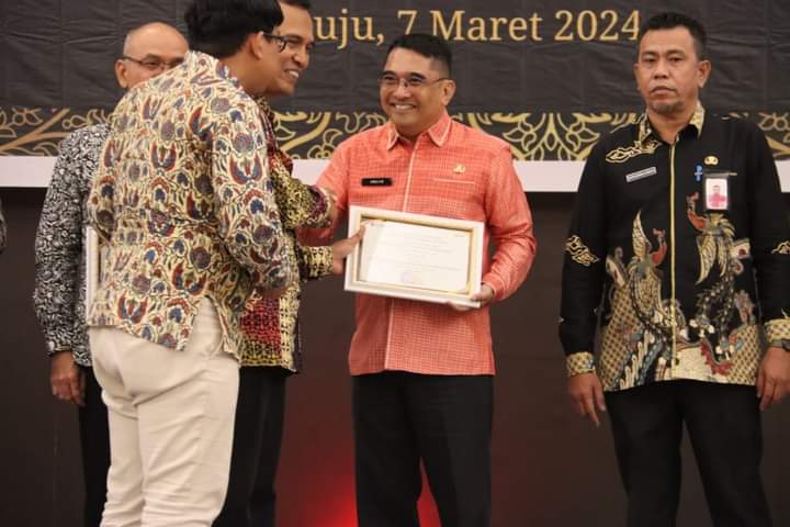 Asisten III Setda Sulbar, Amujib mewakili Pj Gubernur Sulbar Prof Zudan Arif Fakrulloh mendapatkan penghargaan tersebut di Hotel Maleo, Kamis 7 Maret 2024.