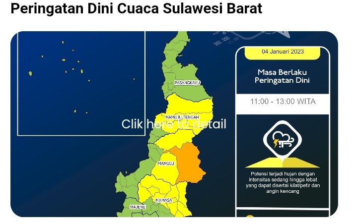Dalam rilisnya tersebut menuliskan, peringatan dini cuaca wilayah Sulawesi Barat tanggap 4 Januari 2023 pukul 10.30 wita berpotensi terjadi hujan dengan intensitas sedang hingga lebat yang dapat disertai kilat/petir dan angin kencang pada pukul 11.00 wita di Kabupaten Mamuju/Kalumpang.