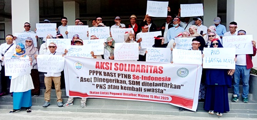 Majene, Sulbar.99news.id–Puluhan Pegawai Pemerintah dengan Perjanjian Kerja (PPPK) di lingkup Universitas Sulawesi Barat (UNSLAR) menggelar aksi solidaritas dengan membentangkan spanduk di depan gerbang gedung Perpustakaan, Kamis (15/5/2025).