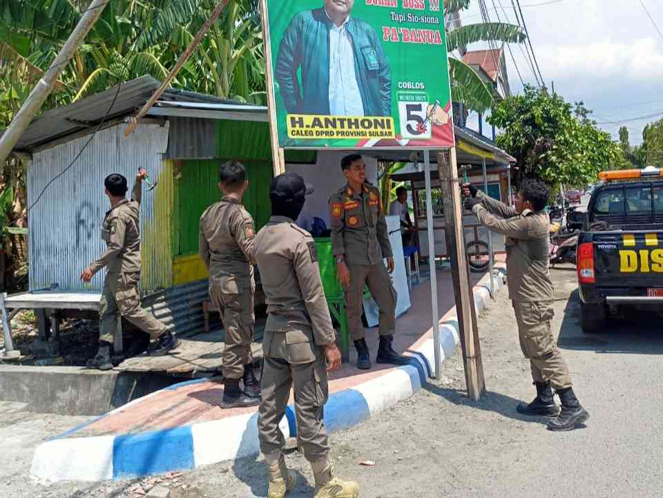 SULBAR99NEWS.COM, MAJENE – Satuan Polisi Pamong Praja Kabupaten Majene terus gencar melakukan penertiban terhadap APK/APS Peserta Pemilu Tahun 2024, Rabu (8/11/2023).