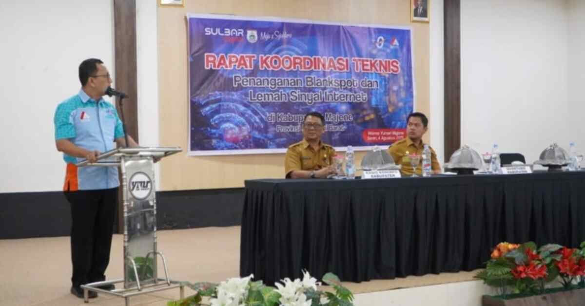 MAJENE — Dinas Komunikasi, Informatika, Statistik dan Persandian (Kominfo SP) Provinsi Sulawesi Barat (Sulbar) menggelar Rapat Koordinasi Teknis (Rakortek) Penanganan Blankspot dan Lemah Sinyal Internet di Kabupaten Majene, Senin 04 Agustus 2025. Kegiatan ini berlangsung di Aula Wisma Yumari, Majene.