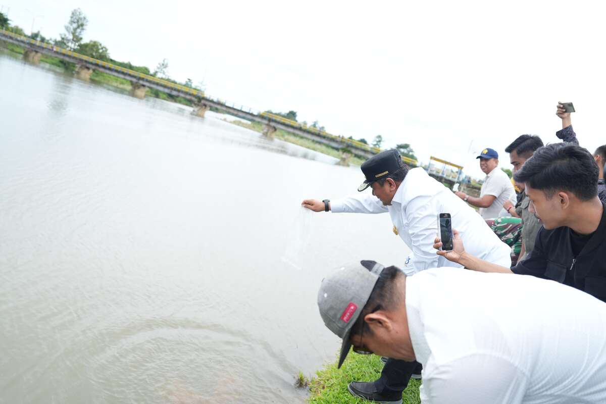 POLMAN — PJ Gubernur Sulbar Bahtiar Baharuddin melakukan penebaran bibit ikan Nila di Bendung Sekka-Sekka Kecamatan Mapilli, Polewali Mandar, Kamis , 30 Januari 2025